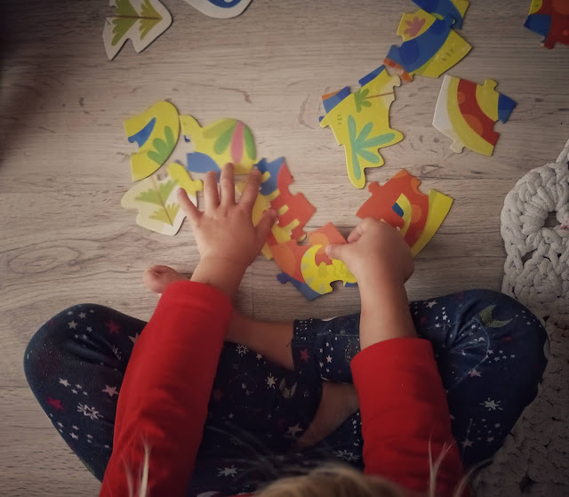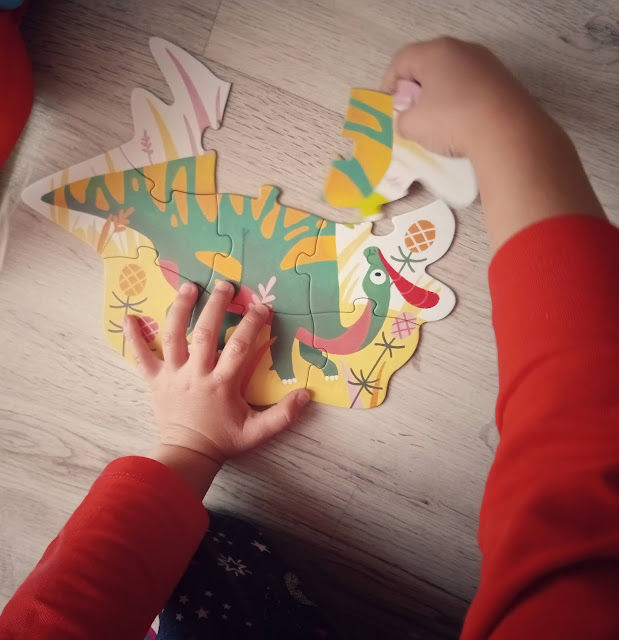 Najmniejsza z układanek składa się z dziewięciu elementów, największą natomiast z 35 puzzli. Puzzle mają duże rozmiary, są dostosowane do małych rączek, łatwo się je dopasowuje i wkłada. Zapewniam Was, że sięgając z dzieckiem po te puzzle fundujecie świetną zabawę również sobie. Przyznam, że ułożenie największej układanki przedstawiającej tyranozaura wbrew pozorom nie było tak proste i wymagało od nas sporo kreatywności.